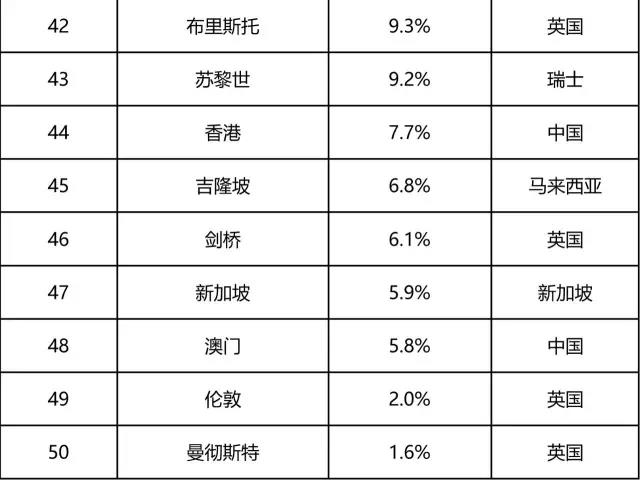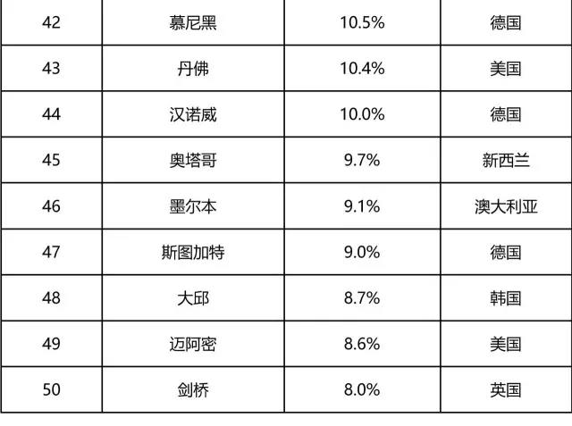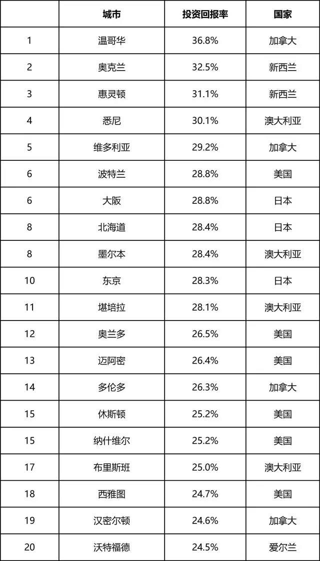 前50名投资回报率最高的城市共来自17个国家,其中美国最多,有16个城市进入前50,其次是澳大利亚、加拿大和英国各有4个,德国和日各有3个,韩国、泰国、西班牙、新西兰和中国各有2个,爱尔兰、法国、荷兰、马来西亚、瑞士和新加坡各有1个。