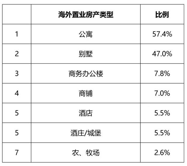 有接近一半的中国高净值人群将海外房地产投资作为最主要标的,他们平均拥有2.3套海外房产,且拥有4套及以上海外房产的人群占比为15.6%。从购置房产类型来看,公寓和别墅以明显的优势成为高净值人群购置最多的海外房产类型。商业型地产因受投资门槛、政策风险、投资回报波动大以及投资者对当地的经济环境不熟悉等原因的影响,在海外置业房产类型所占比例较低。