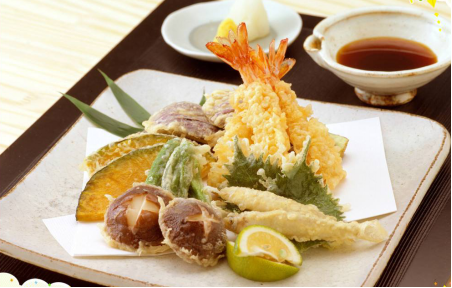 天妇罗:天妇罗算是日本最传统的料理了,是指油炸食品的总成,按照原料分,大致分为:海鲜类天妇罗、蔬菜类天妇罗和禽类天妇罗。天妇罗的食材以海鲜、蔬菜为主,经常见到的食材有虾、鱿鱼、沙钻鱼等白肉鱼和红薯、南瓜、茄子等蔬菜。把几种食材混炸在一起的“Kakiage”也深受客人喜爱。炸好的天妇罗一般蘸用汤汁、酱油,与萝卜泥一起食用。根据食材不同,有时也会直接撒点食盐食用。有很多餐厅还会别具匠心地在食盐中调制咖喱粉、抹茶、梅干等。在天妇罗上淋上一点酸橘汁,美味有独特。