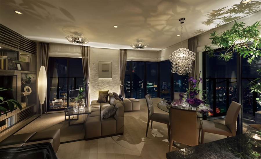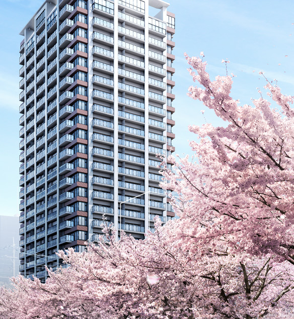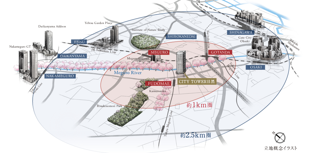 该项目在山手线附近,幽静的住宅区域,前方流淌着见证四季交替的黑目川,春天约3.8km的两岸大约830株的樱花盛开,夏天樱花树的新绿叶萌生在路道两侧,秋天周围被红叶染成赤红色,冬天精致的彩灯被称为“冬のサクラ”,将四季的景色一览无遗。
