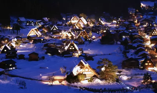 白川乡最有名的是村庄内连成一片的合掌造民宅,一种独特的日本民居建筑。因屋顶形状很尖,像一个合着的手,所以名为合掌造。300年前,当地人为了抵御严寒和豪雪,就地选用木材,利用榫卯技术建造出坚固耐用的建筑结构。为了减轻除雪的负担,屋顶坡度倾斜50-60°,并采用茅草覆盖,冬暖夏凉,创造出适宜大家族居住的建筑形式。这片来自古老智慧的建筑群,以及附近的五崮山村落,全部被选入联合国教科文组织的世界遗产!虽说白川乡内一年四节都风光秀丽,然而冬季白雪皑皑的白川乡更胜一筹。厚厚的积雪覆盖在倾斜的屋顶,与黑棕色的木屋形成强烈的对比,绵延2公里,像是一个静谧隐世的桃源。冬天来白川乡最大的亮点,就是这里的亮点仪式。每年1月中旬到2月下旬的周末傍晚,青色的夜里就会举行亮灯仪式,暖黄的灯光点亮了静谧的童话王国,白雪和光芒交织出梦幻的场景。
